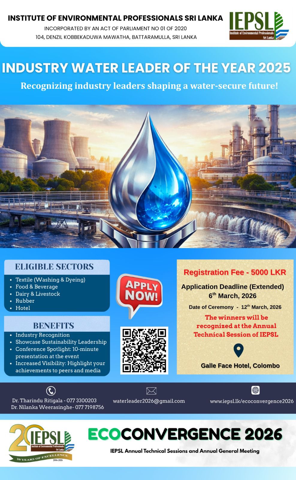 Adding special significance to EcoConvergence2026, IEPSL will also commemorate its 20th Anniversary during the event, marking two decades of commitment to advancing environmental professionalism and sustainable development in Sri Lanka. This milestone offers an opportunity to reflect on the Institute’s journey, honour its legacy, and reaffirm its vision for the future.